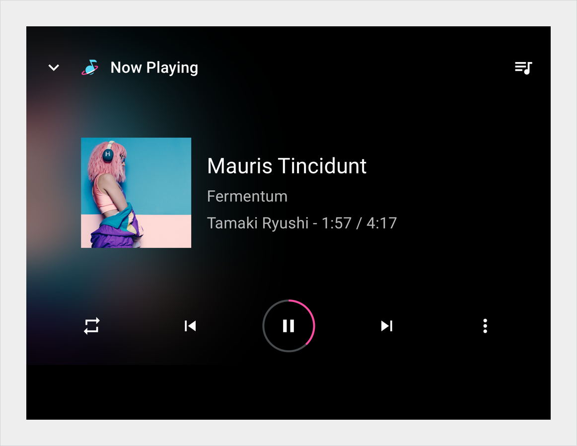 Presentation of currently playing media item (for example, a song), including title,