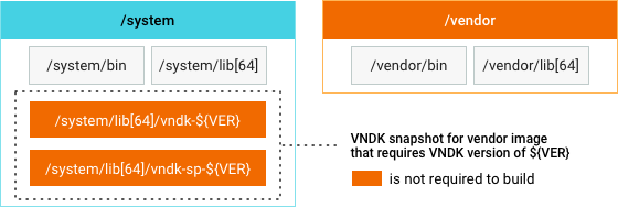 Starting in Android 9, new versions of Android will include at least one snapshot of VNDK-core and VNDK-SP directories for older versions in the Android source code. At build time, required snapshots will be installed to /system/lib[64]/vndk-${VER} and /system/lib[64]/vndk-sp-${VER} (directories that can be used by the vendor partition), where ${VER} is the string variable that represents the version name of the VNDK snapshot.