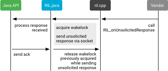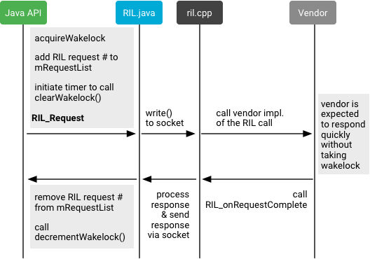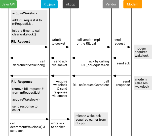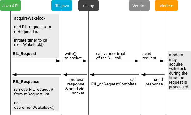 - After processing the request, the modem sends an interrupt to the vendor code that acquires wakelock and sends a response to ril.cpp, which in turn acquires wakelock and sends a response to the Java side.