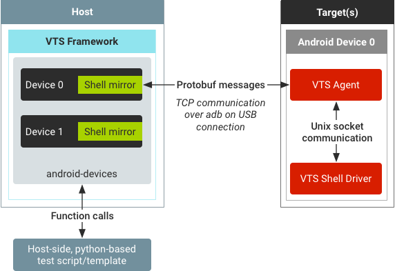 - Extendable. Shell command communications between VTS framework and device driver are wrapped in protobuf to enable potential compression, remoting, encryption, etc. in the future. Other possibilities for improving performance are also available, including device-side result parsing when the communication overhead becomes larger than result string parsing.